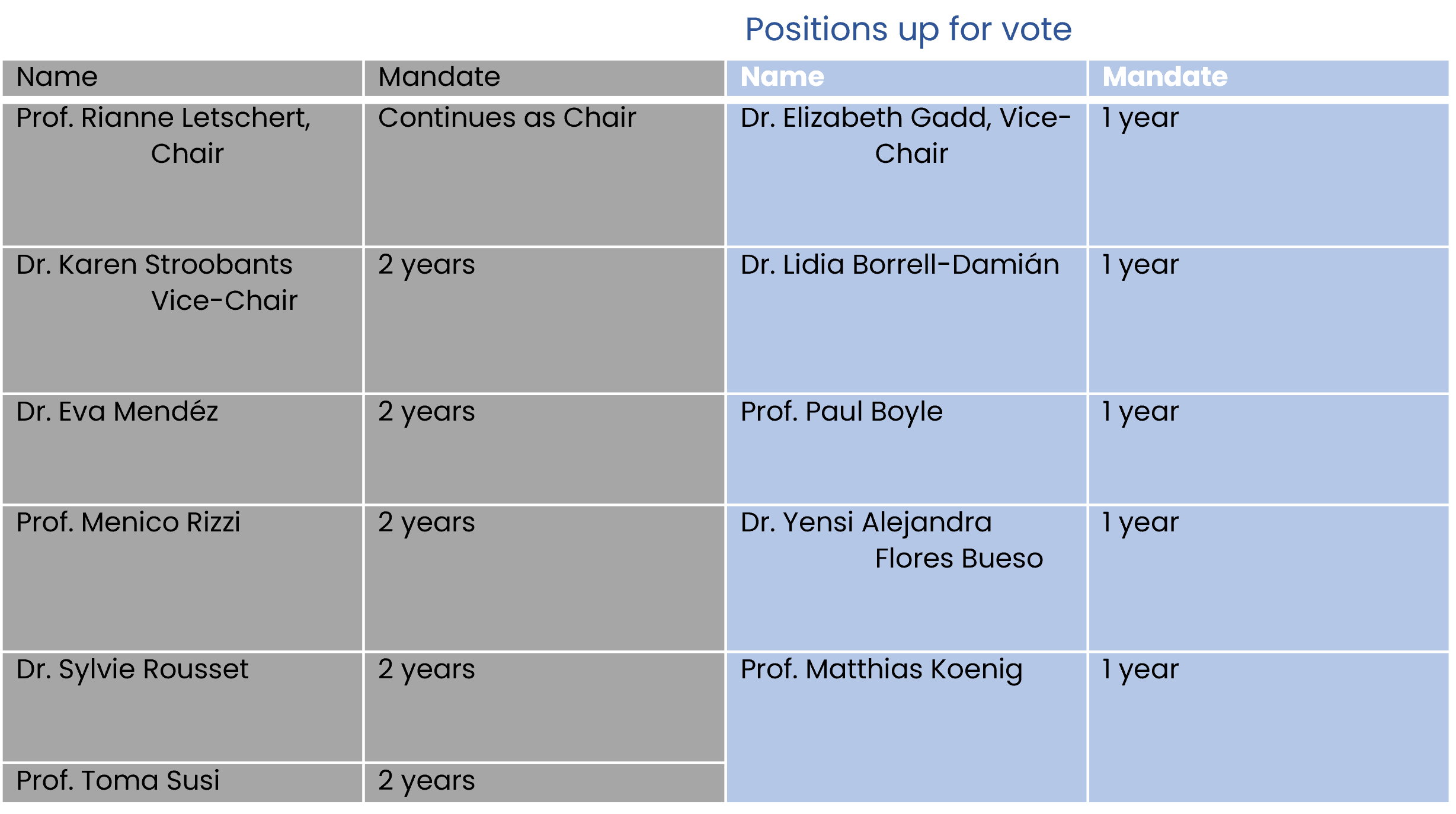Candidacies will be presented and voted upon during the General Assembly (voting window will open 16th November and be closed during the General Assembly Meeting on the 15th December). The duration of the position will start as of the announcement of the voting results.